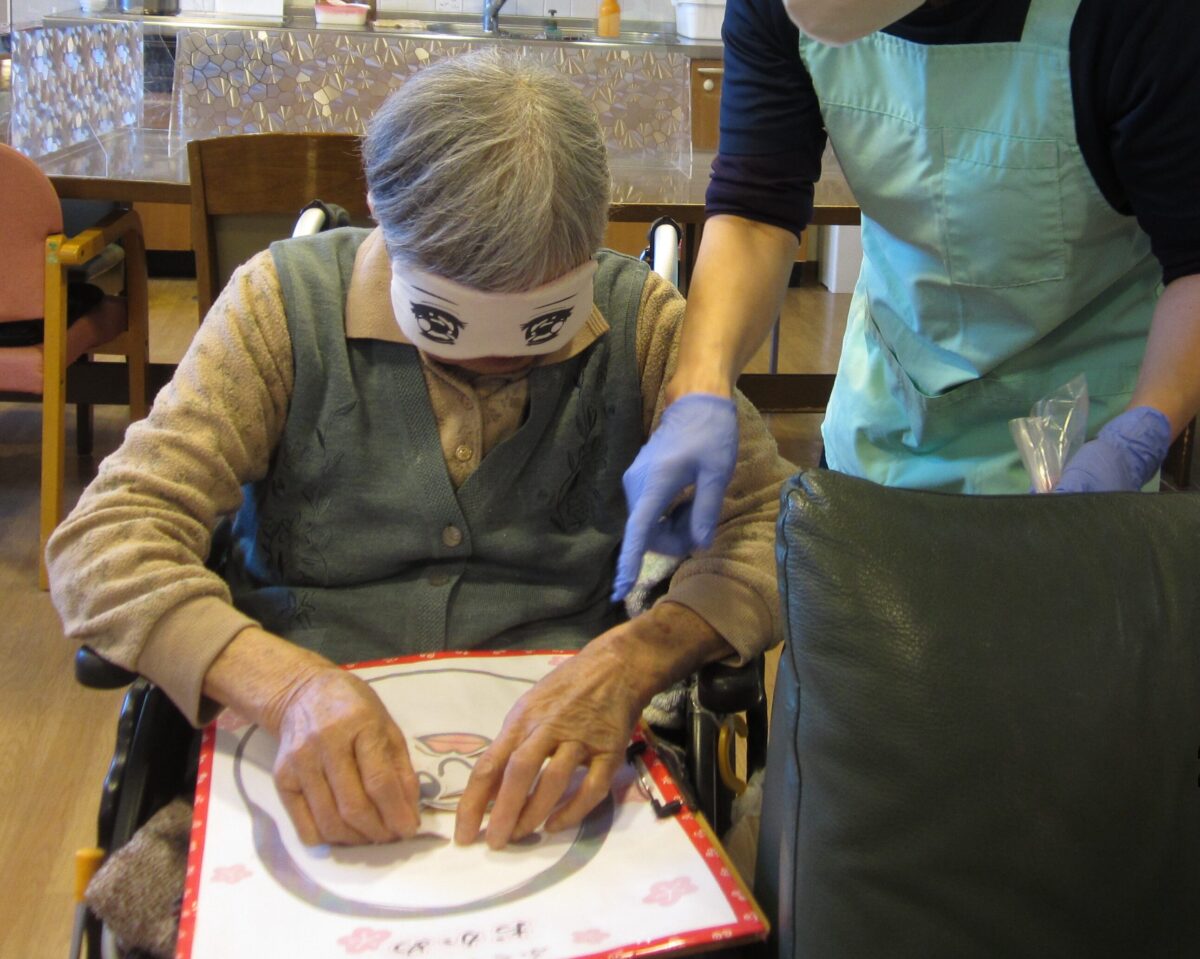 1月、グループホーム第二やまももにて、ご利用者の皆様が福笑いと書き初めのレクリエーションに参加されました。