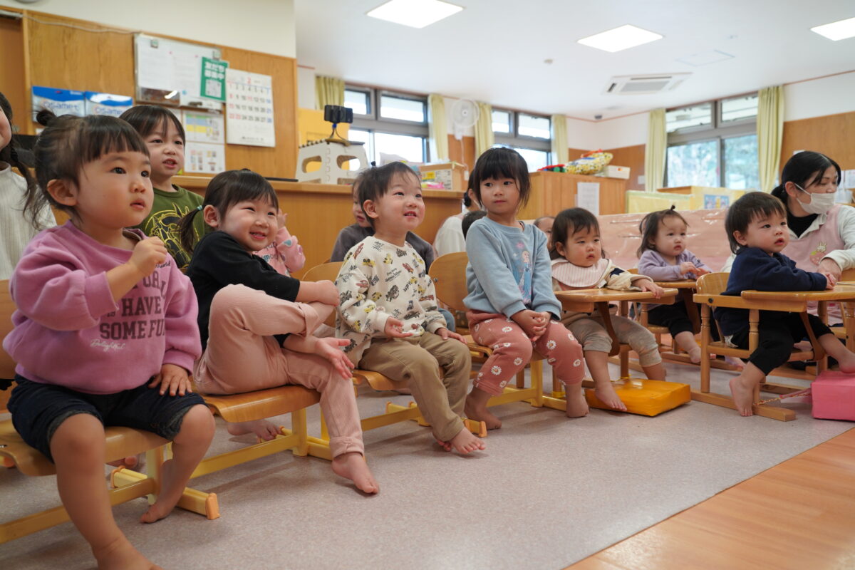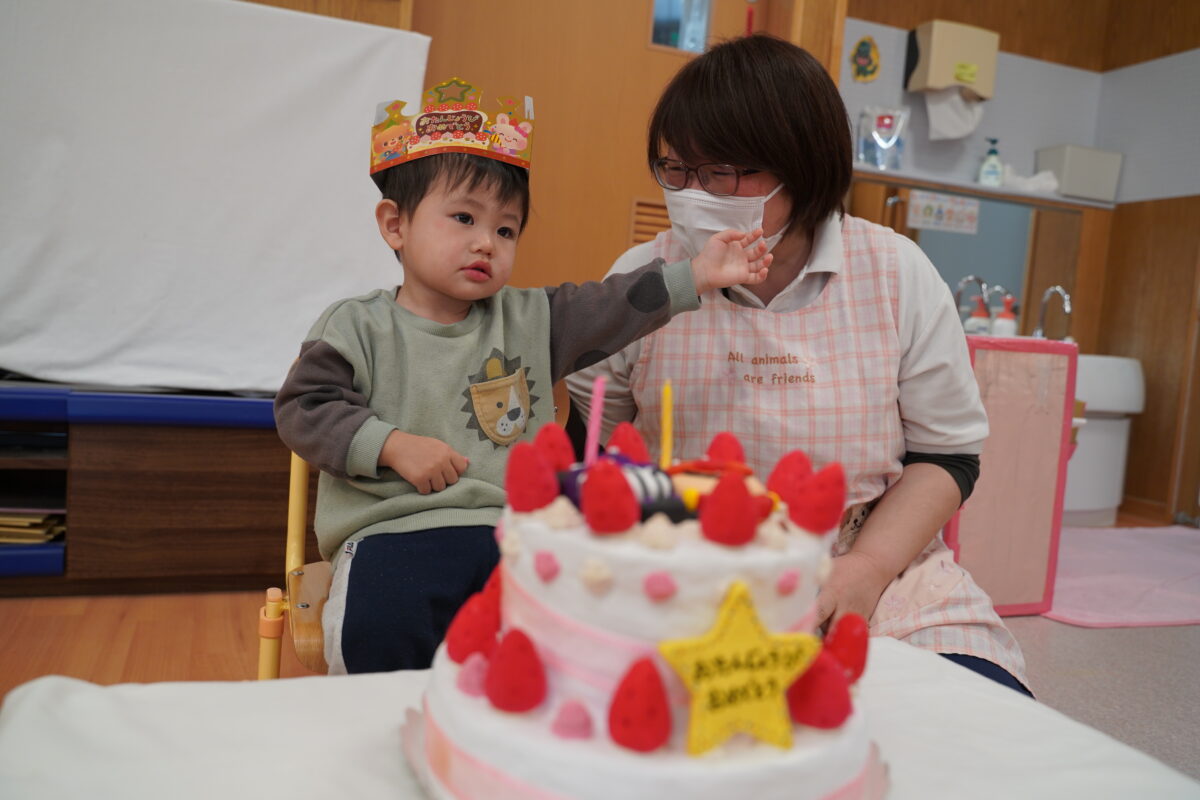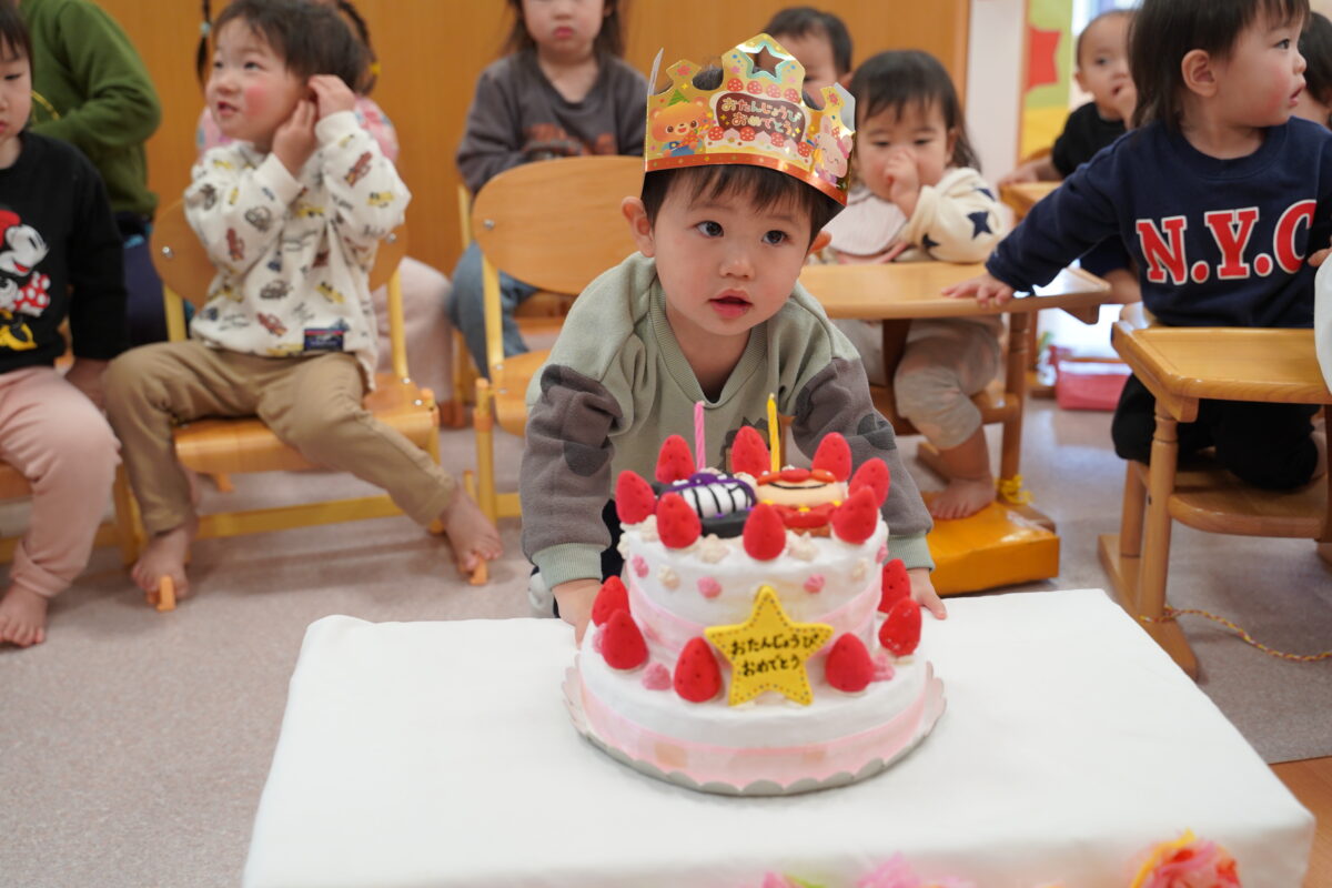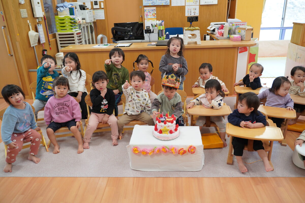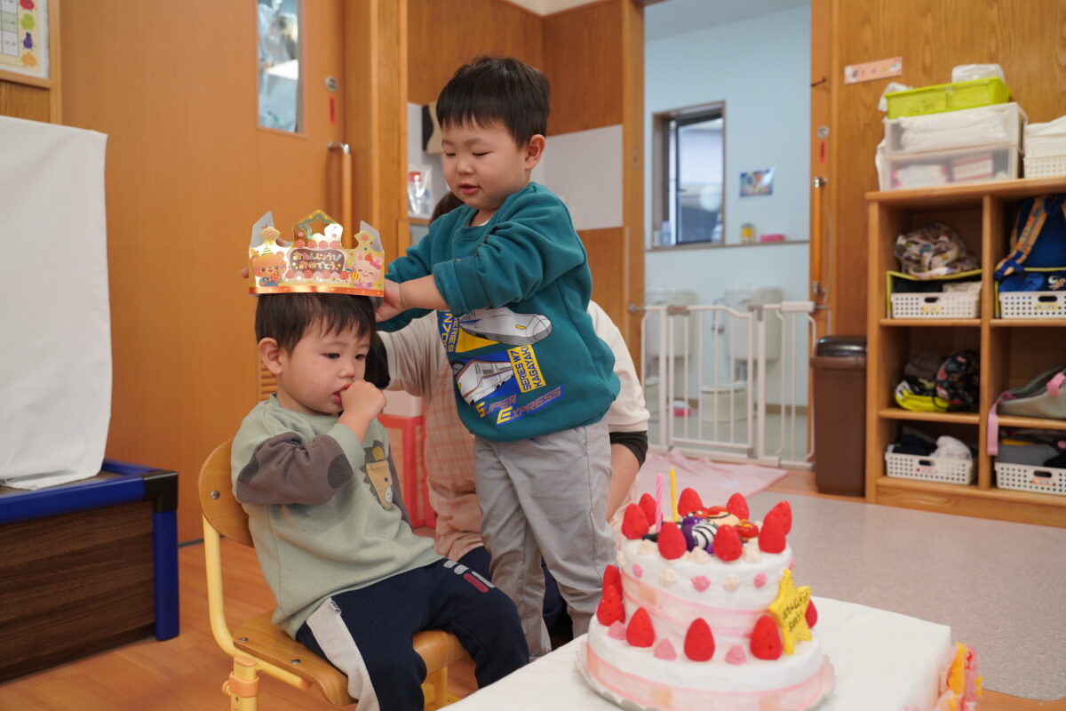 その後に行われたお誕生日会では、今月お誕生日を迎える子どもたちをみんなでお祝いしました。主役の子どもたちは少し照れながらも嬉しそうな表情を見せ、友だちから祝福されることで、誕生日という特別な日を実感している様子でした。