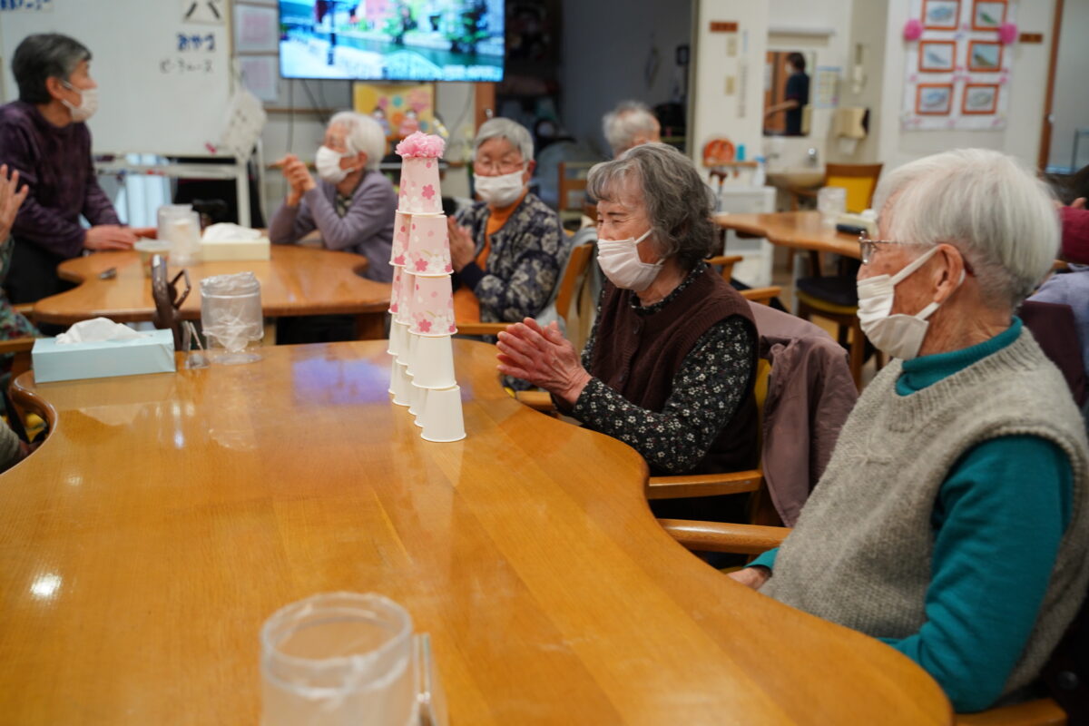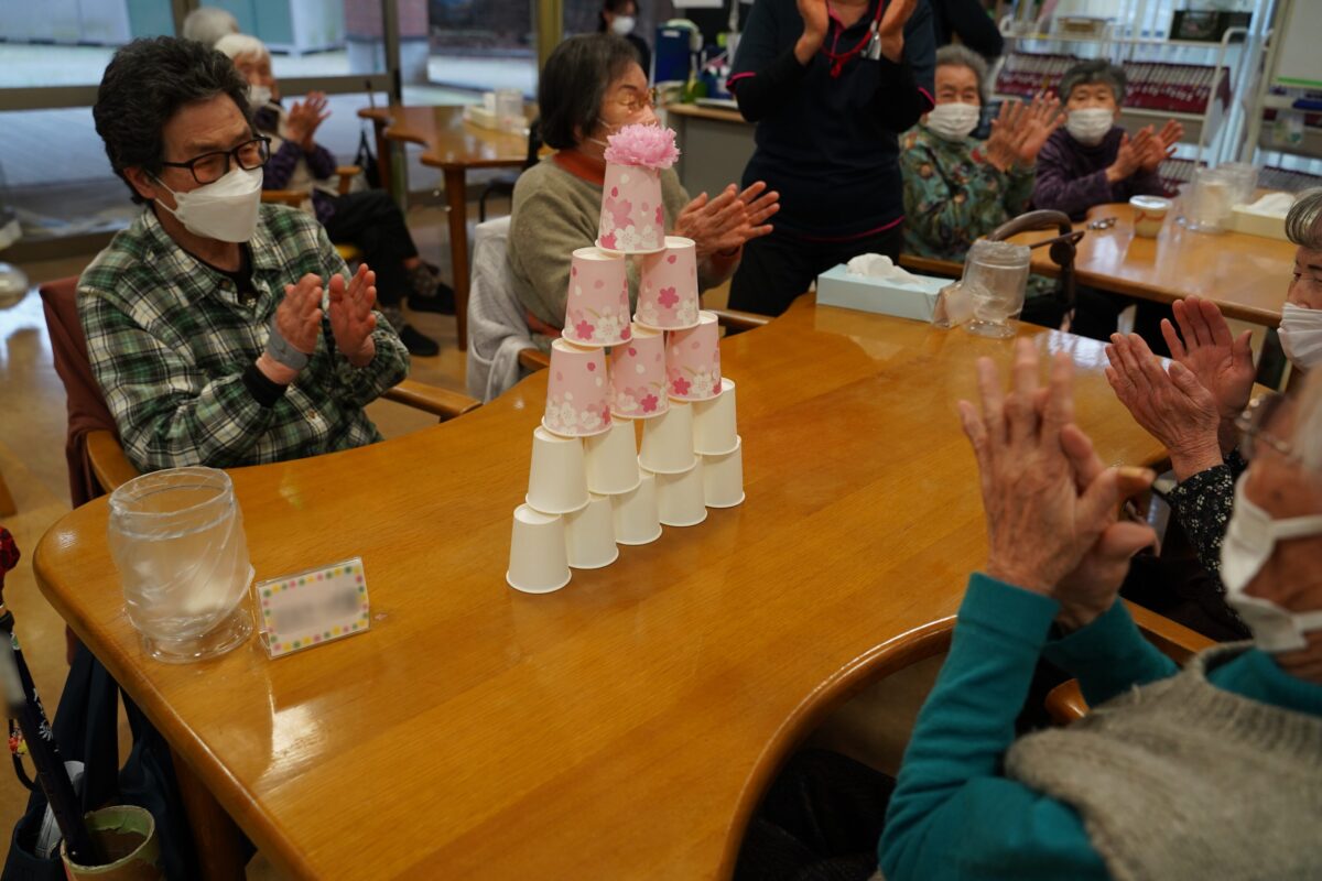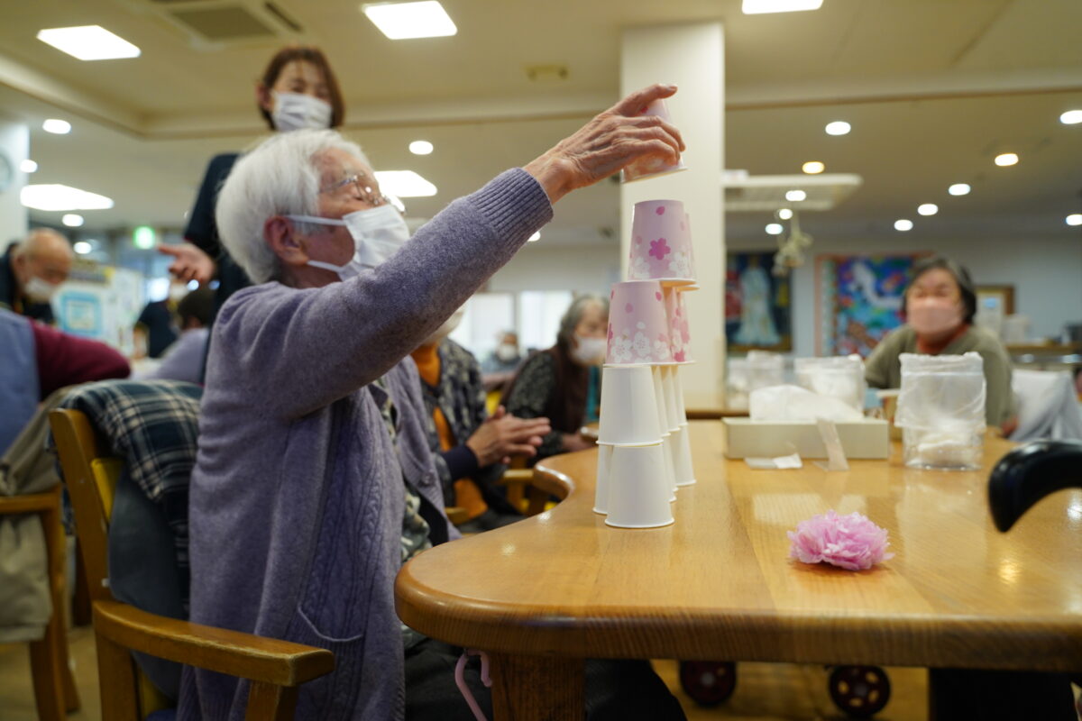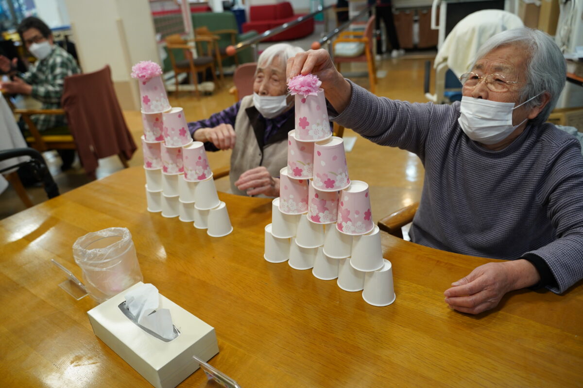 このゲームは、桜に見立てたコップを積み上げていく内容で、まず積まれたコップを両手でばらし、その後片手で再度積み上げるまでのタイムを競います。職員による説明の後、ご利用者の皆さまにご参加いただきました。