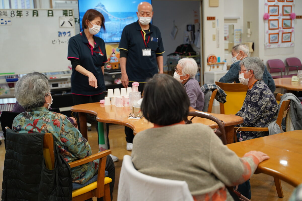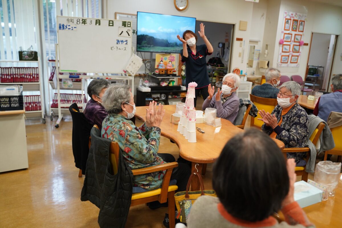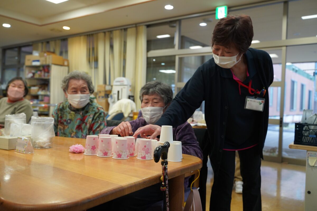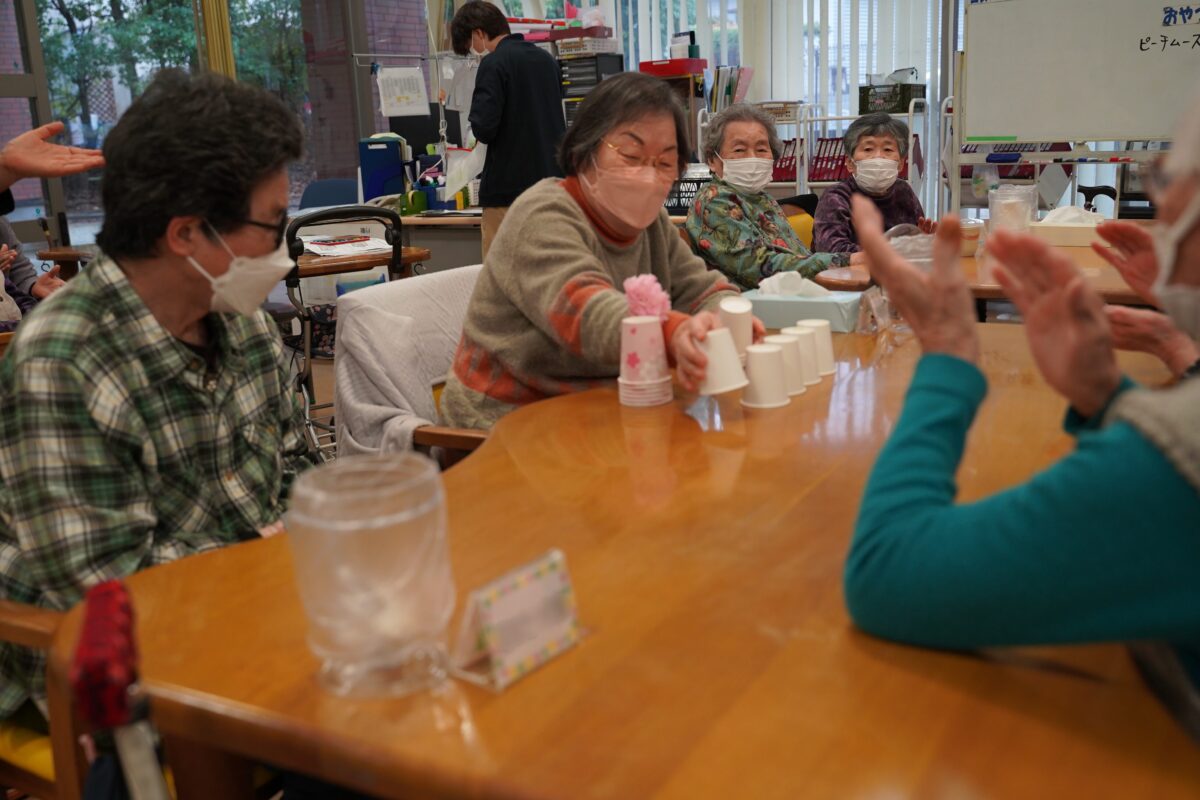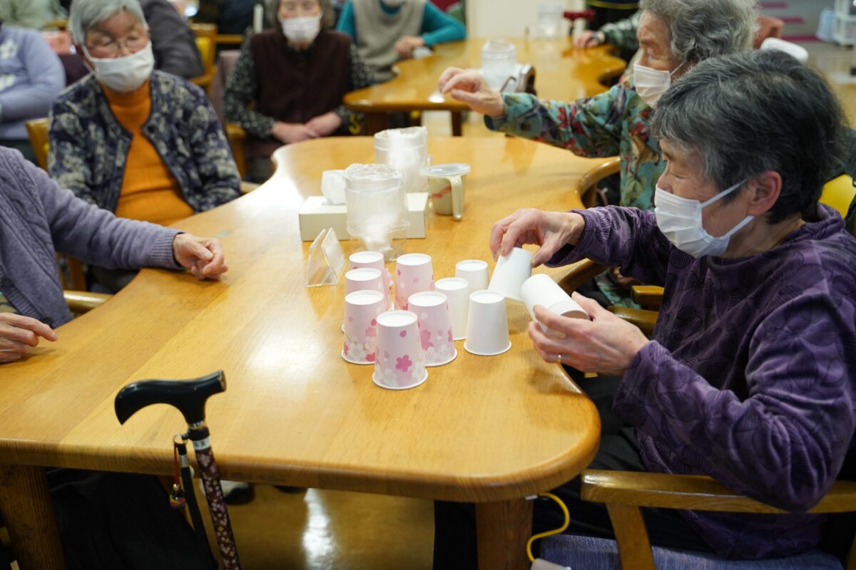 このゲームは、桜に見立てたコップを積み上げていく内容で、まず積まれたコップを両手でばらし、その後片手で再度積み上げるまでのタイムを競います。職員による説明の後、ご利用者の皆さまにご参加いただきました。