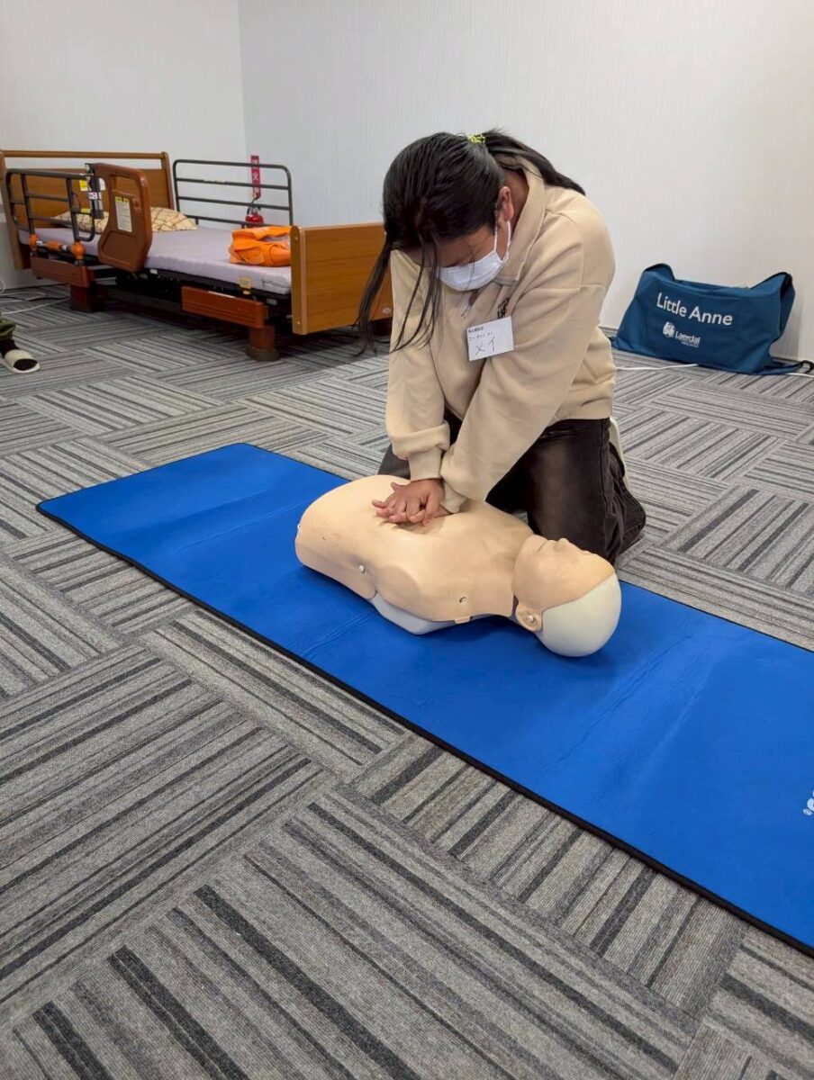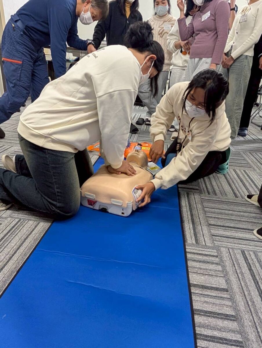 また、消防署の方のご指導のもと、消火器の使用方法や心臓マッサージなどの実技講習にも取り組みました。どの場面でも実習生は真剣に学び、積極的に理解を深める姿が見られました。