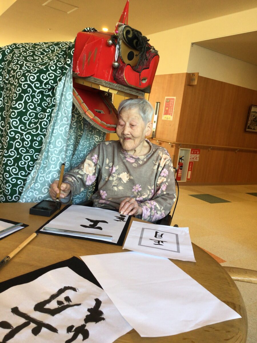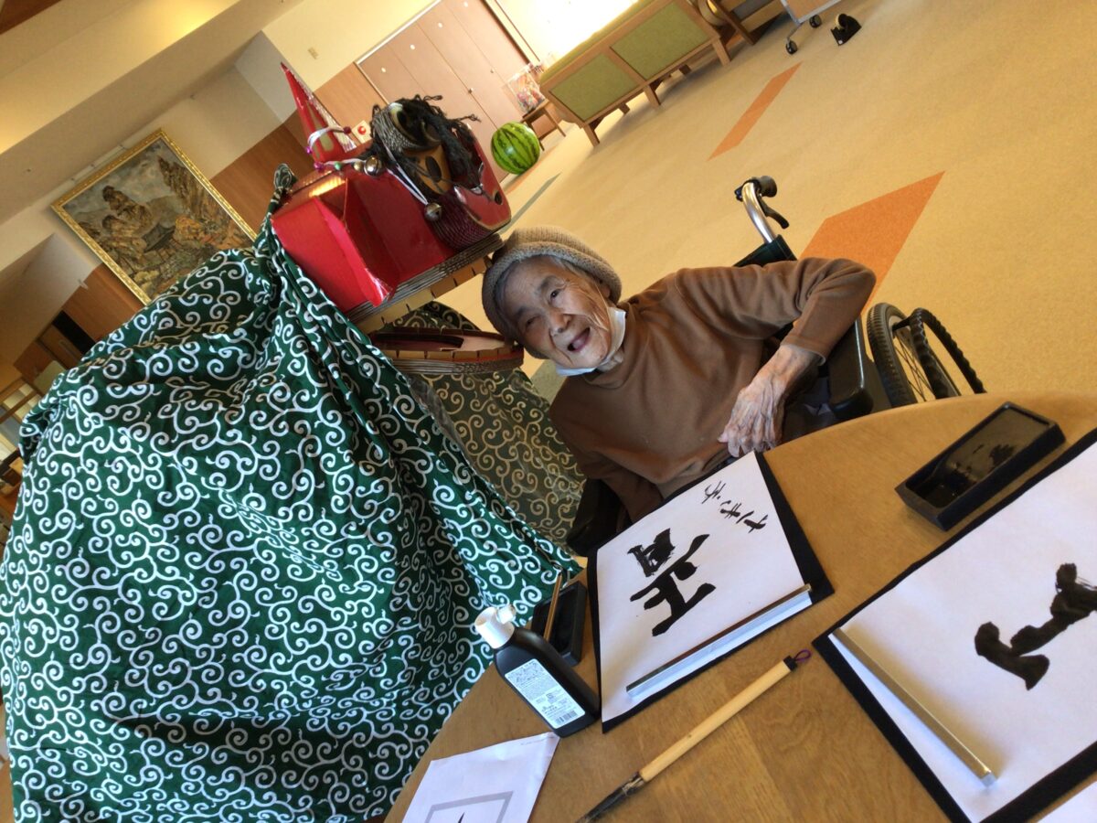 書初めでは、筆を手に取り、思い思いの文字を書かれるご利用者の姿が見られました。