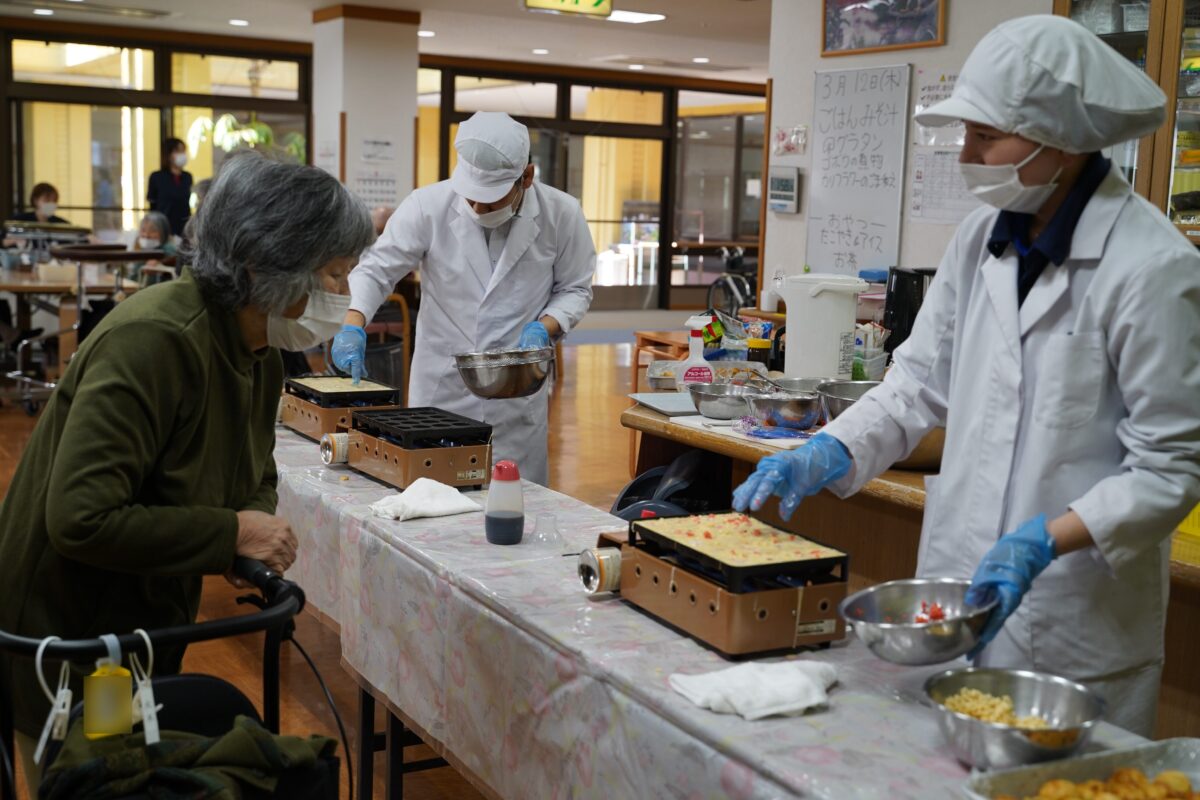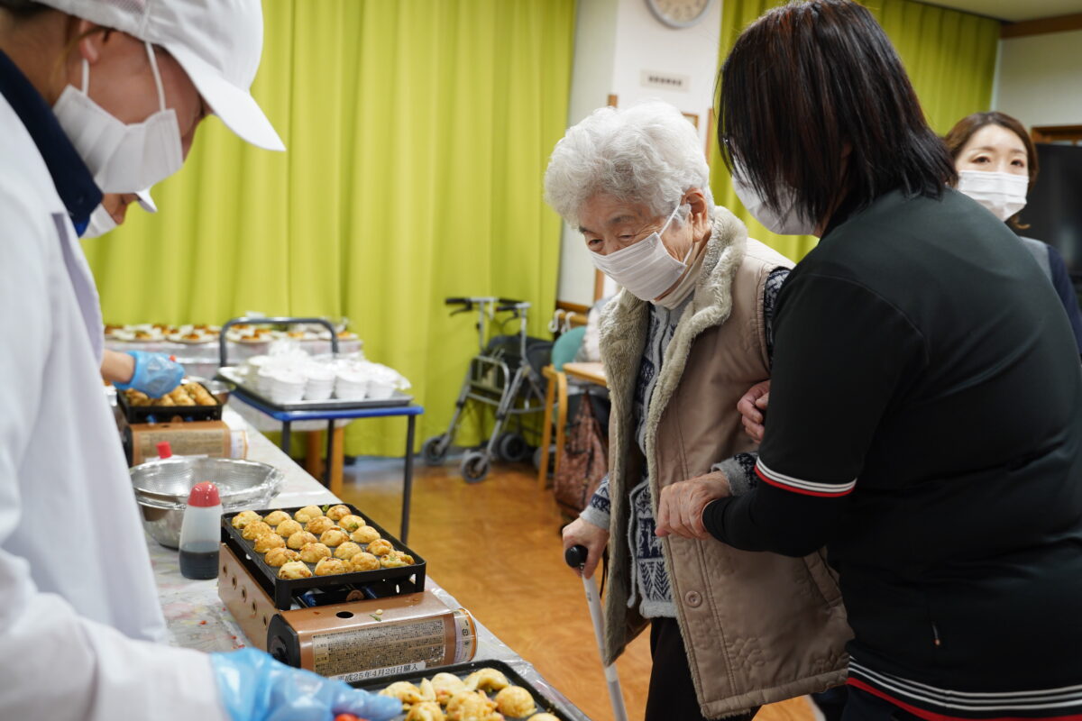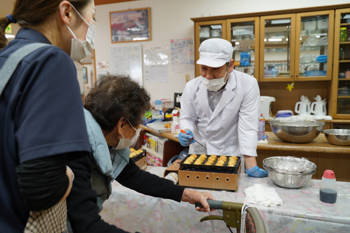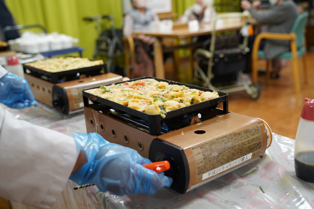 当日は、職員がその場でたこ焼きを手作りし、だし生地をたこ焼き器に流し込みながら一つひとつ焼き上げました。焼き上がる様子をご覧になったご利用者の皆さまからは笑顔も見られ、実際に召し上がっていただいた際には「うまい」とのお声もいただきました。