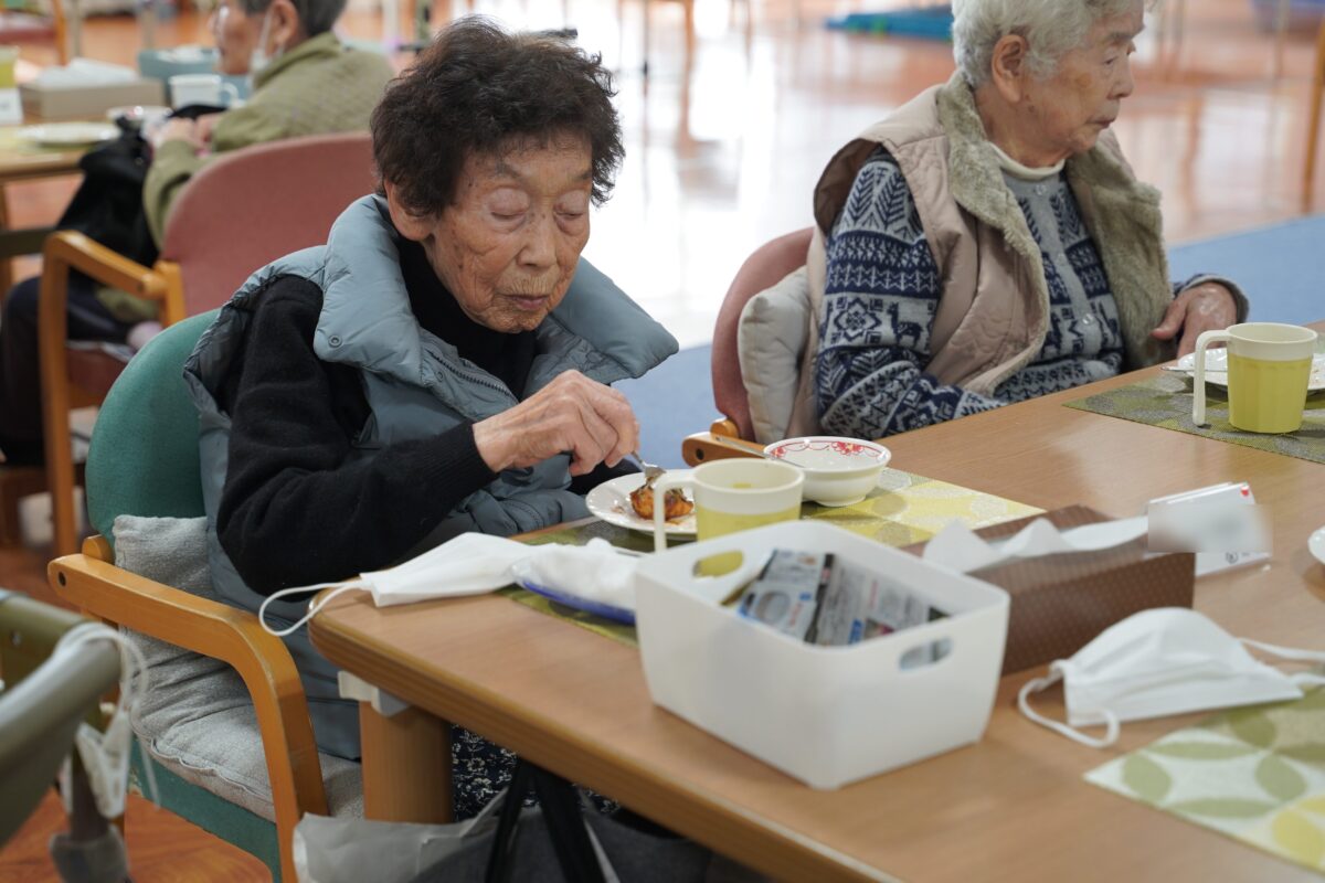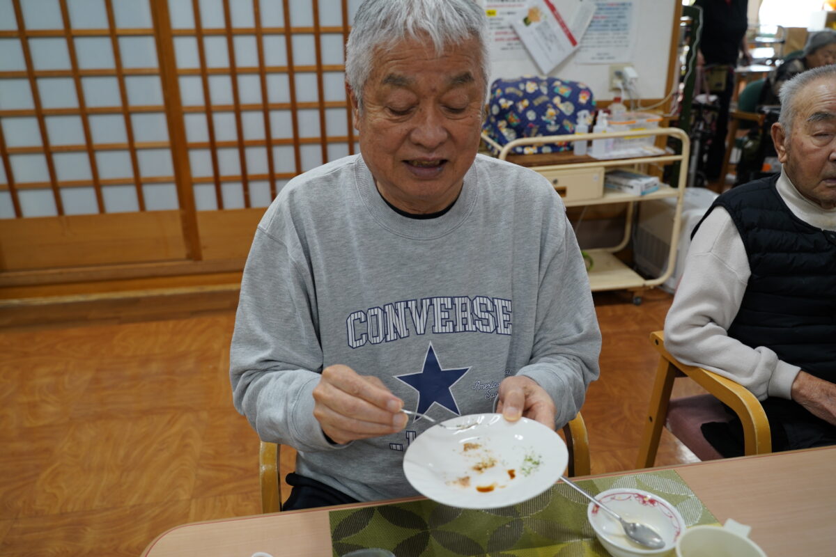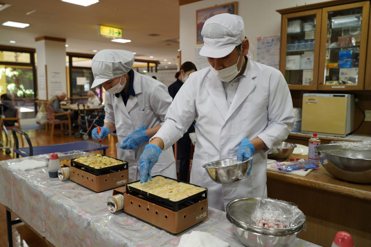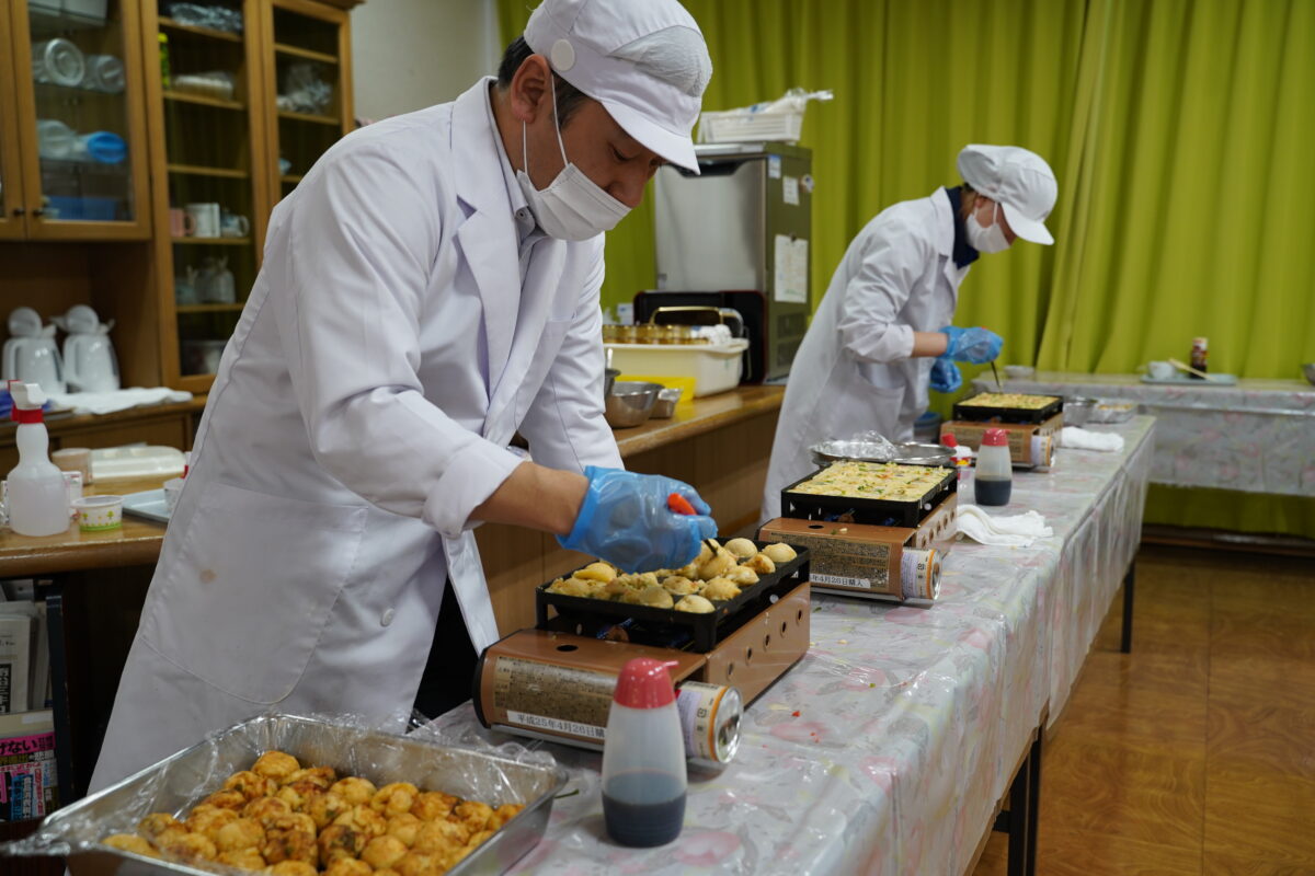 当日は、職員がその場でたこ焼きを手作りし、だし生地をたこ焼き器に流し込みながら一つひとつ焼き上げました。焼き上がる様子をご覧になったご利用者の皆さまからは笑顔も見られ、実際に召し上がっていただいた際には「うまい」とのお声もいただきました。