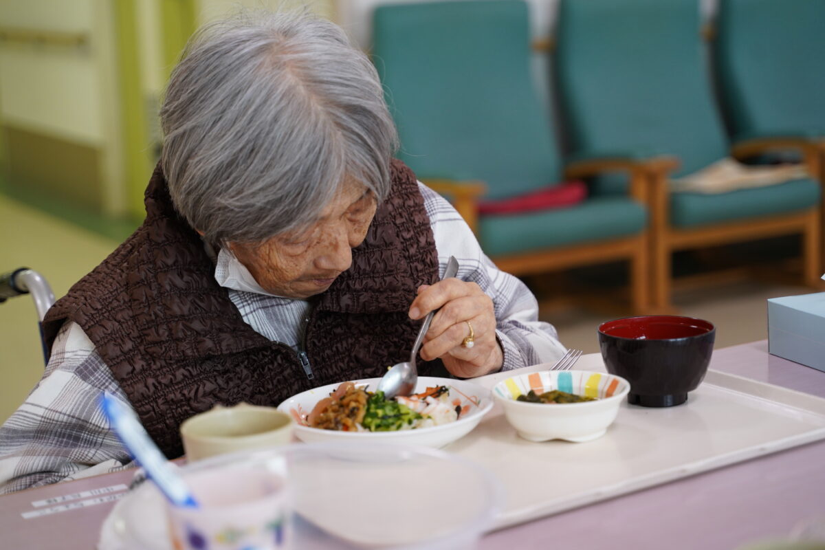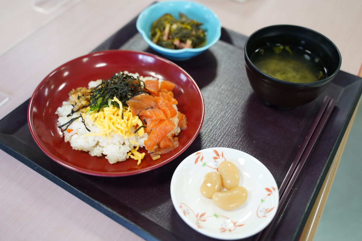 当日の基本メニューは、海鮮ちらし寿司、菜の花の煮浸し、すまし汁の三品です。なお、1階の通所リハビリテーションでは、これら三品に加え白花豆を追加した四品をご用意いたしました。彩り豊かなちらし寿司が並び、ご利用者の皆さまからは「おいしいです」とのお声も聞かれ、和やかなひとときとなりました。